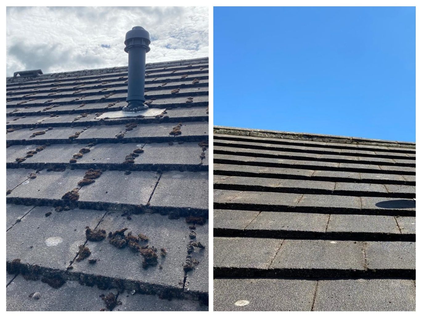 Moss removal, soft‑wash treatment, debris clearance and a full gutter clean after the job.